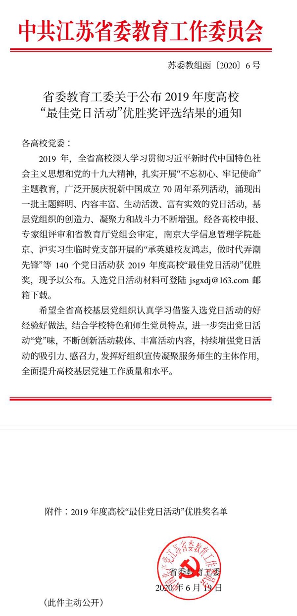 我院喜获江苏省高校“最佳党日活动”优胜奖